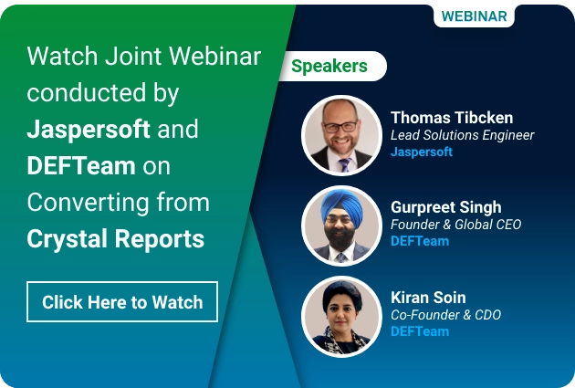 Let DEFTeam guide your seamless transition from Crystal Reports to Jaspersoft. Contact us today for a free consultation and a personalized demo of our automated migration utility.